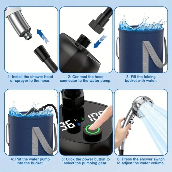 La ducha portátil de camping TRJZWA es muy fácil de usar, basta con mantener pulsado el interruptor durante 3 segundos para poner en marcha la bomba. Pantalla digital inteligente: muestra la potencia y la temperatura en tiempo real. La bomba de la ducha tiene dos velocidades y está equipada con 3 modos de cabezal de ducha y un interruptor de parada de agua. Se puede cambiar fácilmente de modo girando el interruptor del cabezal de ducha.
