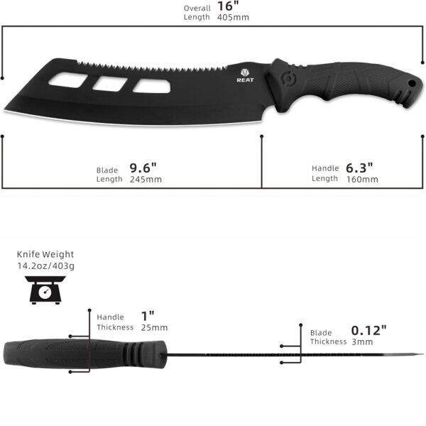 El Machete con sierra Reat de 16 pulgadas esta hecho de acero 420 de primera calidad: este machete está fabricado con acero 420 de alta calidad, lo que le confiere una dureza y una resistencia a la corrosión excepcionales. Ya sea para cortar árboles o podar arbustos, este machete de alta resistencia puede realizar fácilmente la tarea.