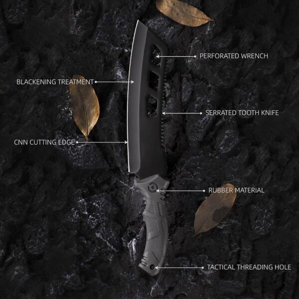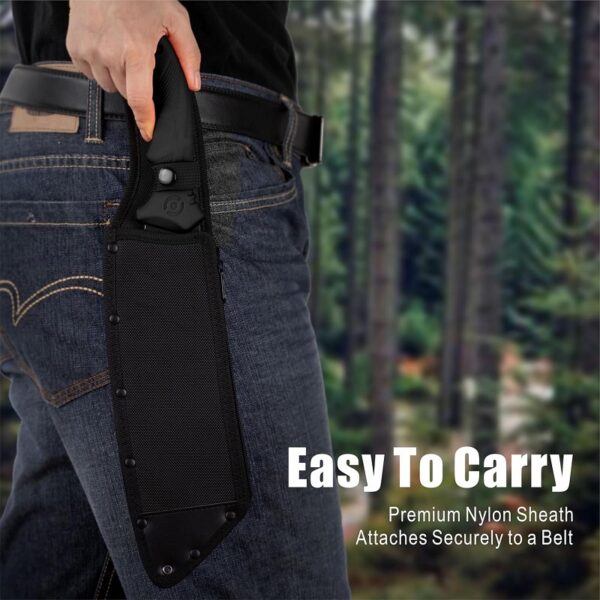 Funda protectora: cada machete viene con una funda protectora duradera para un almacenamiento y transporte seguros. Ya sea en casa o en la naturaleza, este machete con funda garantiza que su cuchillo permanezca seguro.