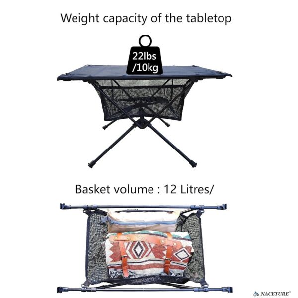 Cesta de malla desmontable: esta mesa de camping portátil incluye una pequeña cesta de malla que se acopla a las patas, debajo del tablero, y que puede utilizarse para guardar comida extra, bebidas u otros equipos cuando te relajas al aire libre.