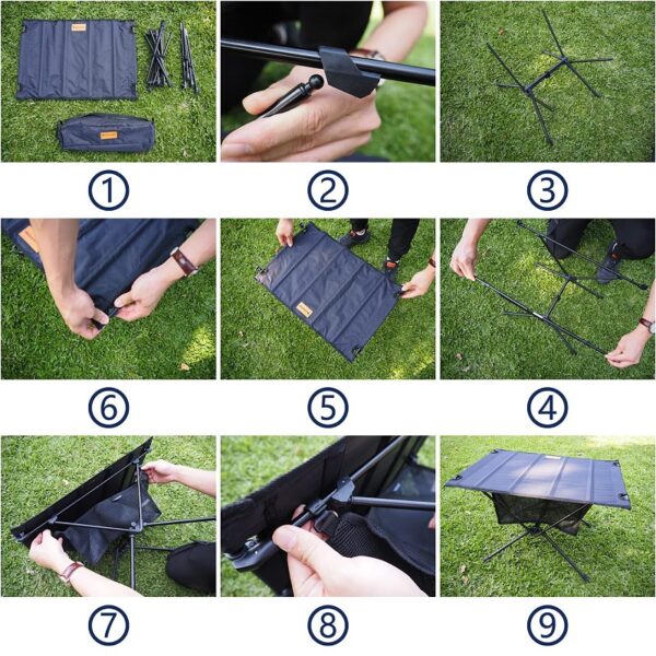 Tablero de tejido de poliéster de alta resistencia: cada mesa plegable de camping también está equipada con un tablero desmontable de tejido 600D que proporciona una superficie firme para tazas, cuencos, platos, linternas y un montón de otros equipos de supervivencia y accesorios de senderismo.