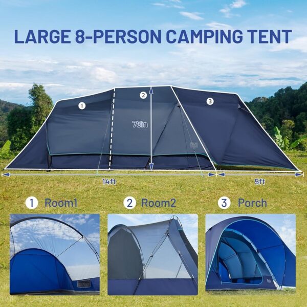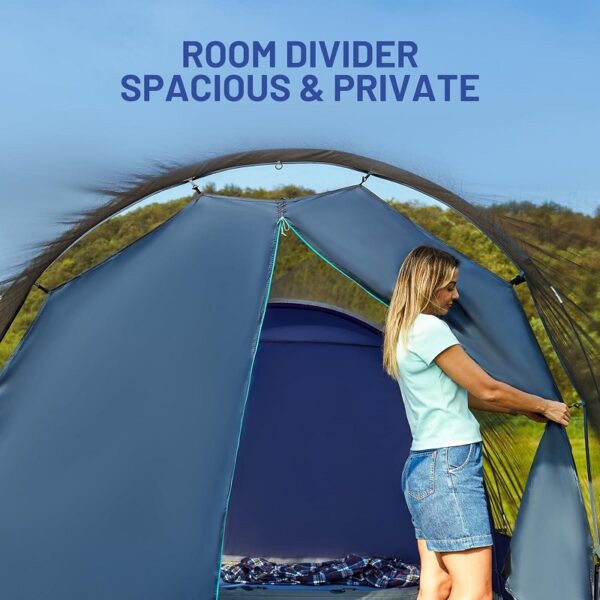 Tienda de campaña de 2 habitaciones y porche de 1.52 x 2.44 mts: el separador de habitaciones incluido divide la tienda en dos habitaciones y dos puertas para mayor privacidad. El porche adicional de 1.52 x 2.44 metros proporciona una cómoda zona de descanso para su familia y amigos. Ideal para acampadas familiares.