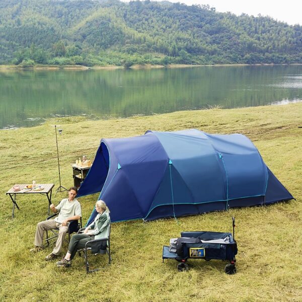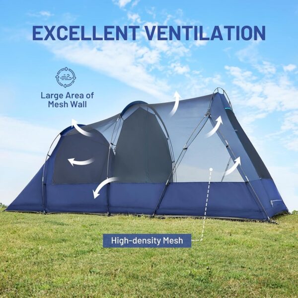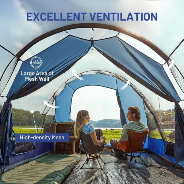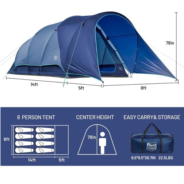 Tienda espaciosa y alta para 8 personas: con unas dimensiones de 5.79 x 2.43 x 1.98 metros, en la tienda caben perfectamente 3 colchones hinchables queen size u 8 sacos de dormir. La altura central de 1.98 pulgadas crea un espacio generoso para ponerse de pie y moverse.