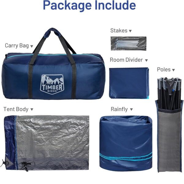 El paquete incluye: 1 bolsa de transporte, 1 cuerpo de tienda, 1 toldo impermeable, 4 juegos de postes de fibra de vidrio, 20 estacas de acero y 1 separador de ambientes.